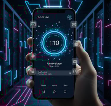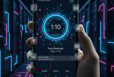 O FocusFlow permite que você crie "Zonas de Foco" personalizadas. Você pode definir que, das 9h às 12h, apenas e-mails de clientes específicos e chamadas de urgência podem te alcançar, bloqueando automaticamente todas as redes sociais e notícias.